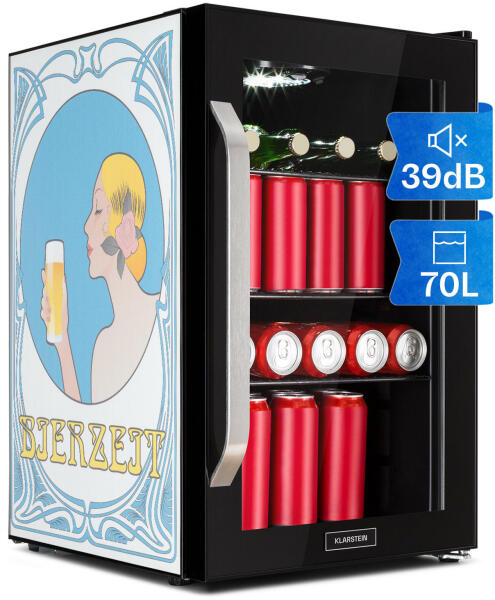Jól behűtve jobban frissít: A Klarstein Beersafe 70 egy kompakt italhűtő 70 literes kapacitással. A csillogó Bierzeit kiadásban stílusos sörtémájú nyomtatással frissíti fel környezetét, és extra pezsgést kölcsönöz konyhájának vagy hobbiszobájának. A három krómozott fémpolc bőséges helyet biztosít az ételek és italok számára. A panoráma üvegajtó kettős szigetelése megőrzi a hideget a belső térben és kint tartja a meleget. A csiszolt rozsdamentes acél előlap csodálatos kontrasztot alkot a fekete belső térrel. További érdekessége a belső LED-világítás, amely még attraktívabbá varázsolja a Beersafe 70 berendezést. A hűtési hőmérséklet kényelmesen beállítható az 5-fokozatos elforgatható vezérlő gombbal 0 és 10 °C közt. A Klarstein Beersafe 70italhűtő minden italt a megfelelő hőmérsékletre hűt.